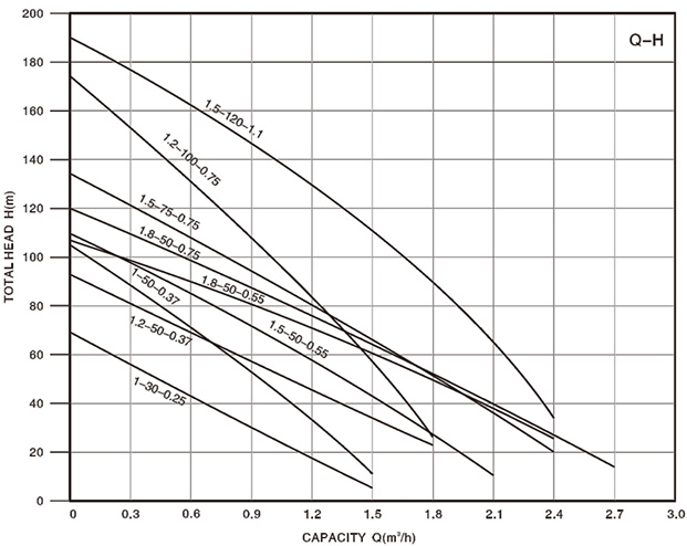 | KW | HP | m³/h | 0 | 0.3 | 0.6 | 0.9 | 1.2 | 1.5 | 1.8 | 2.1 | 2.4 | 2.7 | mm | ||