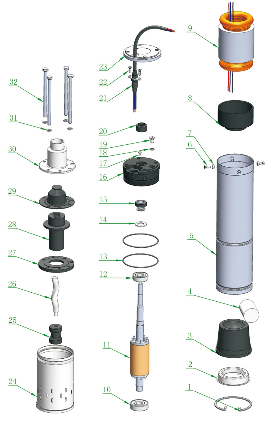 | 4 | Capacitor | 12 | Bearing | 20 | Sand proof cap | 28 | Screw impeller sheath |